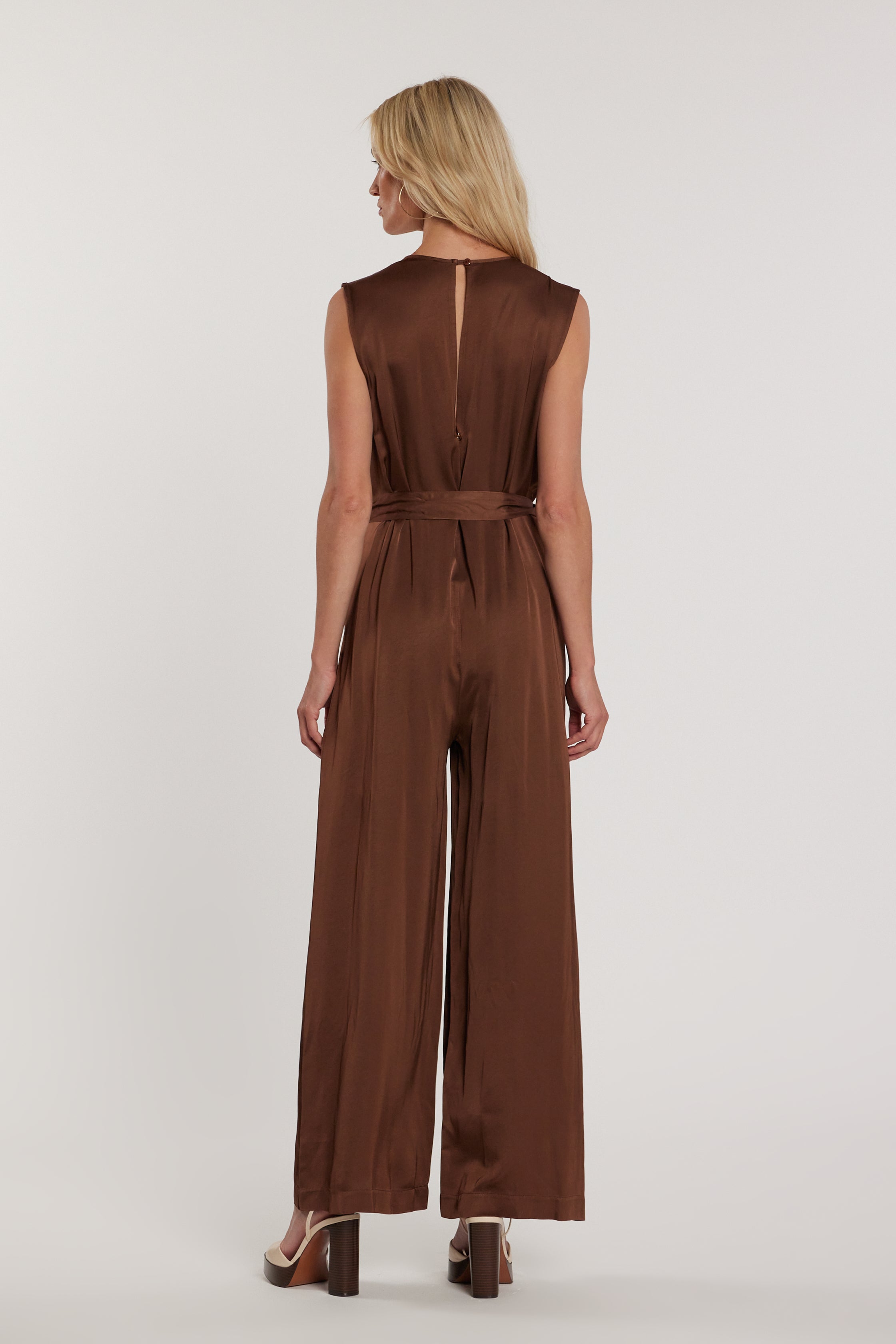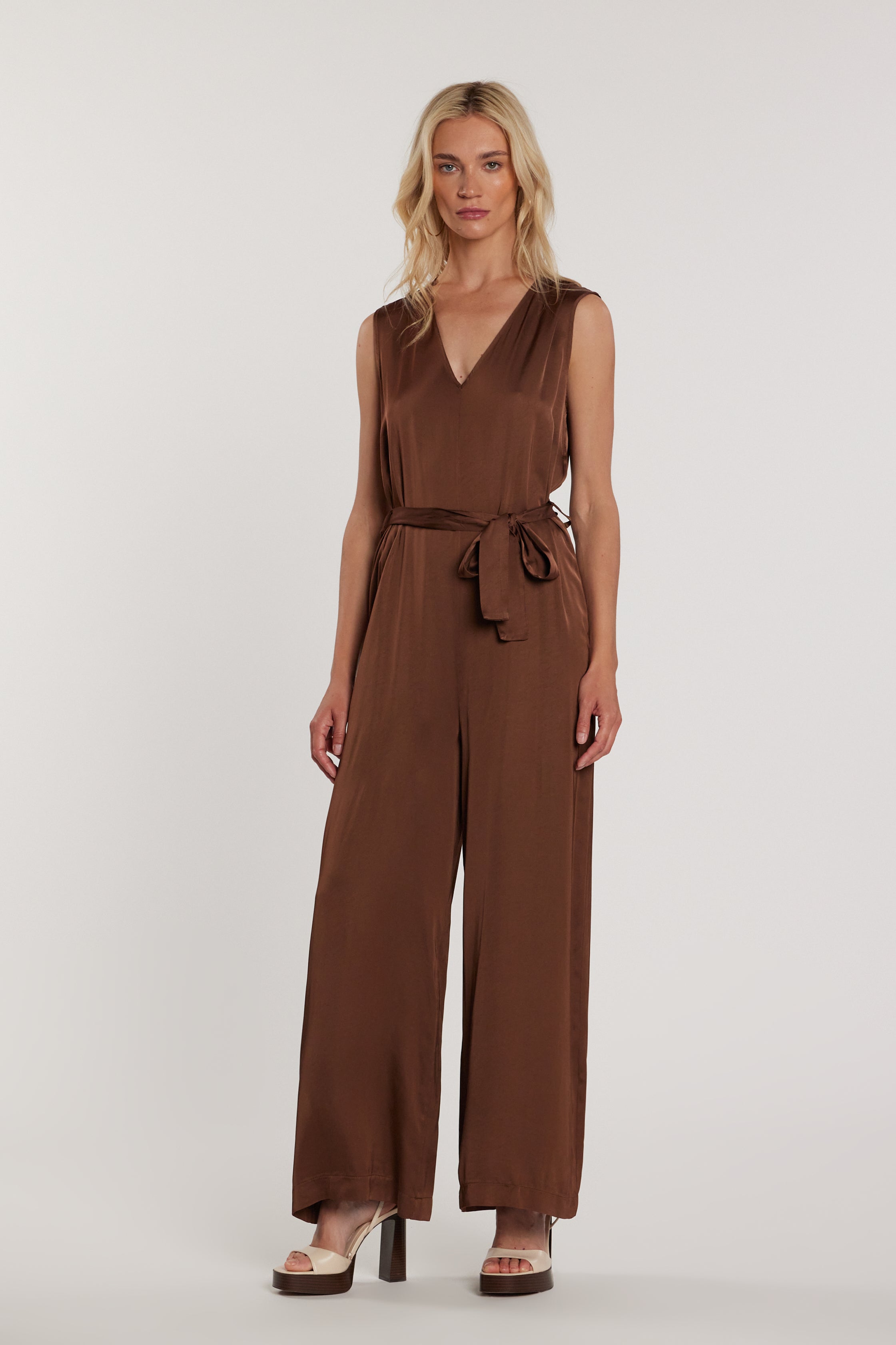 Tuta Pingo lunga senza maniche con scollo a V, goccia sulla schiena, palazzo con cintura, un capo scenografico e femminile. Il palazzo fluido slancia la silhouette, mentre la scollatura e la cintura definiscono il punto vita con eleganza, ideale per occasioni speciali e serate glamour.
