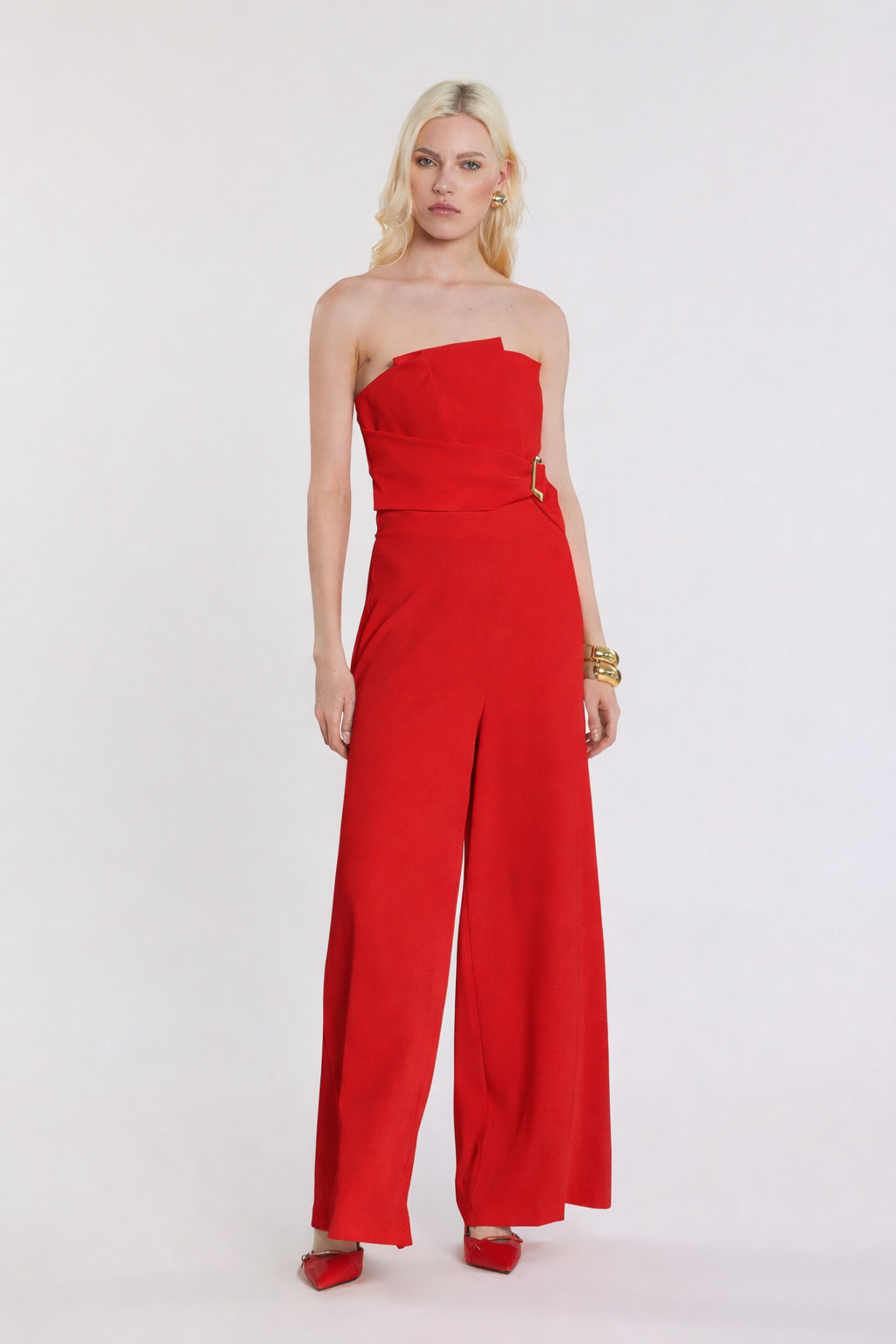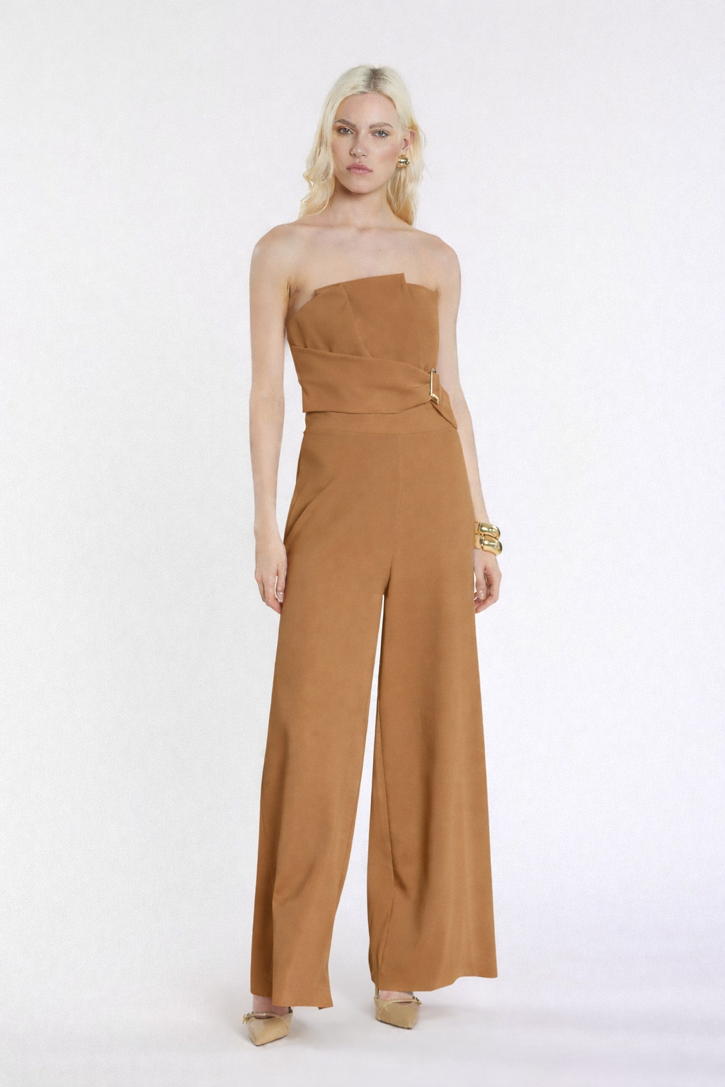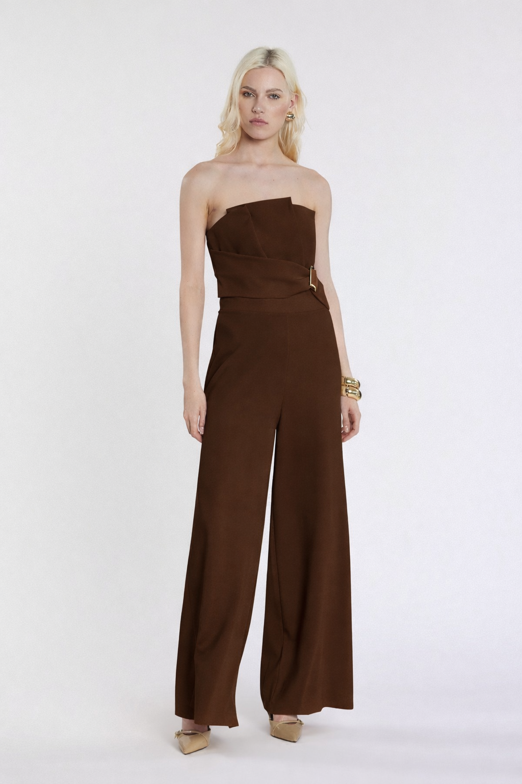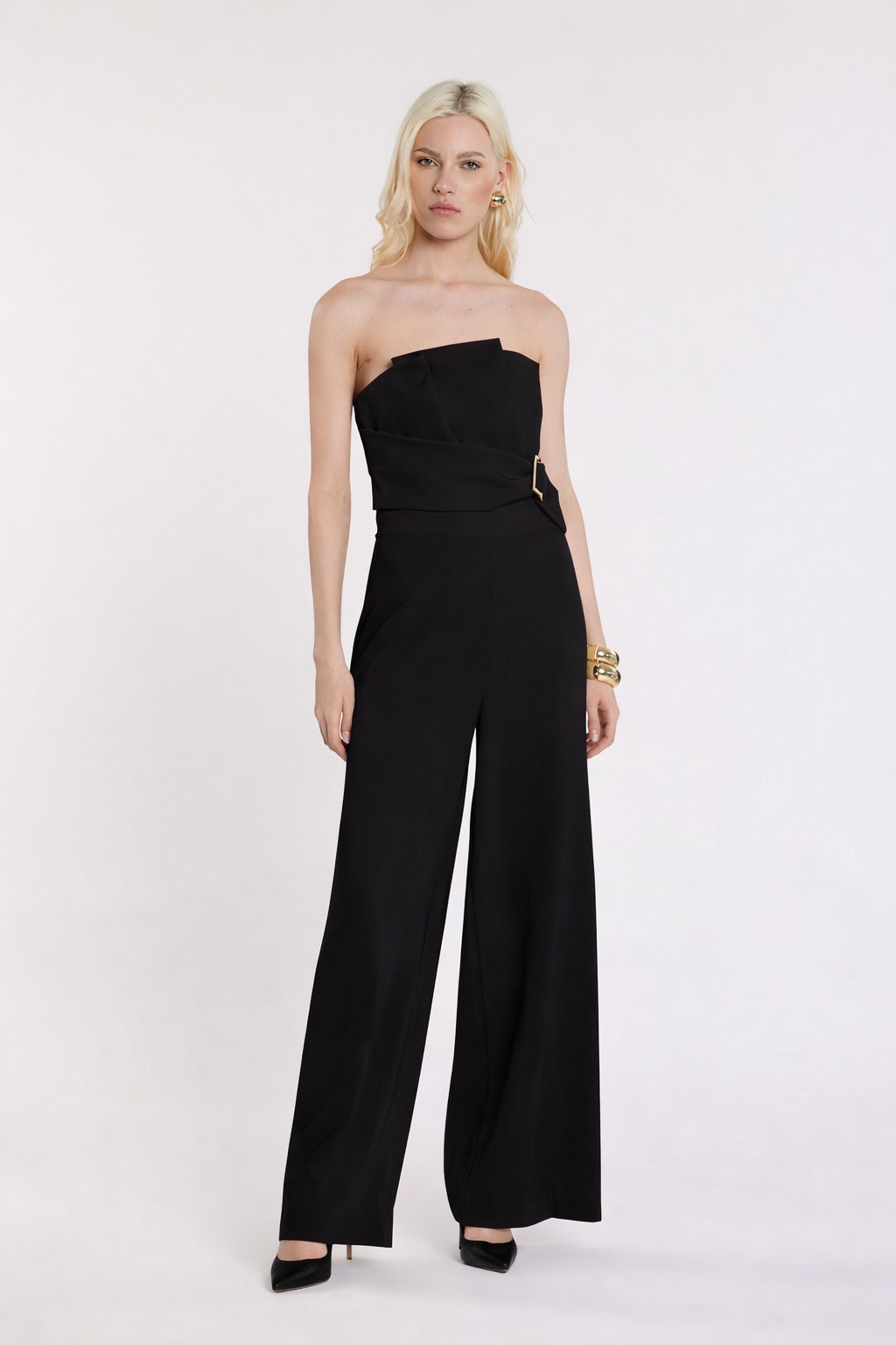 Tuta Uett lunga senza maniche con fascia a ventaglio, pieghe e effetto cintura, un capo scenografico e raffinato. La struttura valorizza il punto vita, mentre le pieghe donano movimento armonioso, perfetta per eventi serali e occasioni speciali.