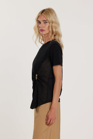 T-Shirt FIRSTY maniche corte con pieghe sul fianco più spilla logo strass asimmetrica
