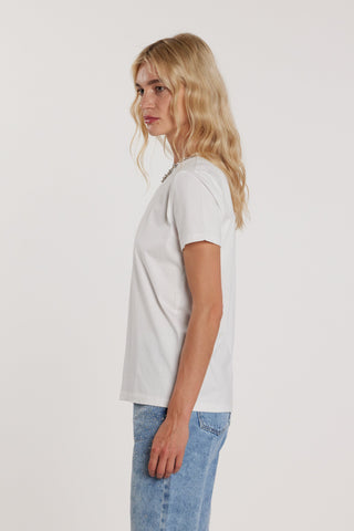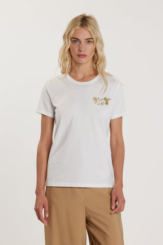 T-Shirt LATERAL maniche corte con arriccio sulla spalla più spilla logo strass