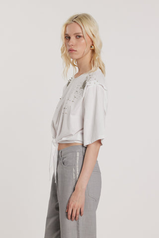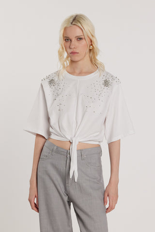 T-Shirt FUNNYS corta maniche corte con dettaglio sulla spalla più applicazioni pietre più nodo fusciacca
