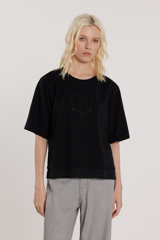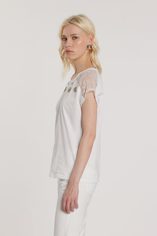 T-Shirt ISABELLE maniche corte con inserti in georgette più ricamo logo più strass