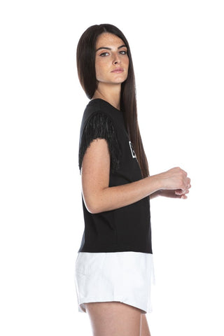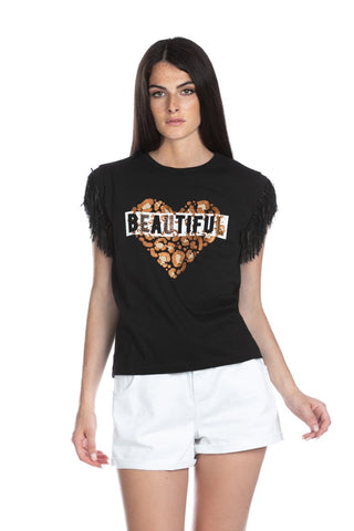 T-shirt BEGO mezza manica con frange stampa cuore più applicazione strass